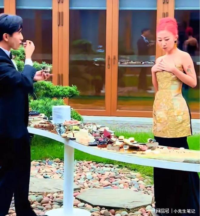 敬酒时刘一丝又换了一身金色礼服,这身礼服倒是跟红色头发很搭配,看着潮流很多。